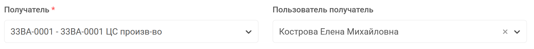 - После выбора склада в поле “Получатель” система автоматически определит МОЛа выбранного склада и укажет его в поле “Пользователь получатель”: