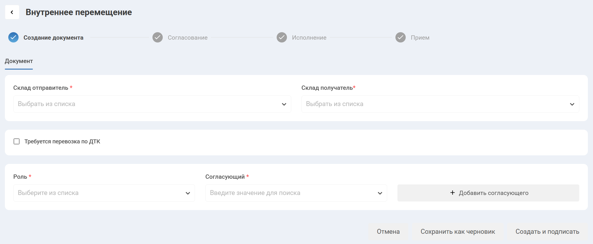 Инициатор выбирает “Внутреннее перемещение” под кнопкой “Добавить” в разделе “Исходящие документы”. Пользователю открывается документ “Внутреннее перемещение” на этапе “Создание документа”:
