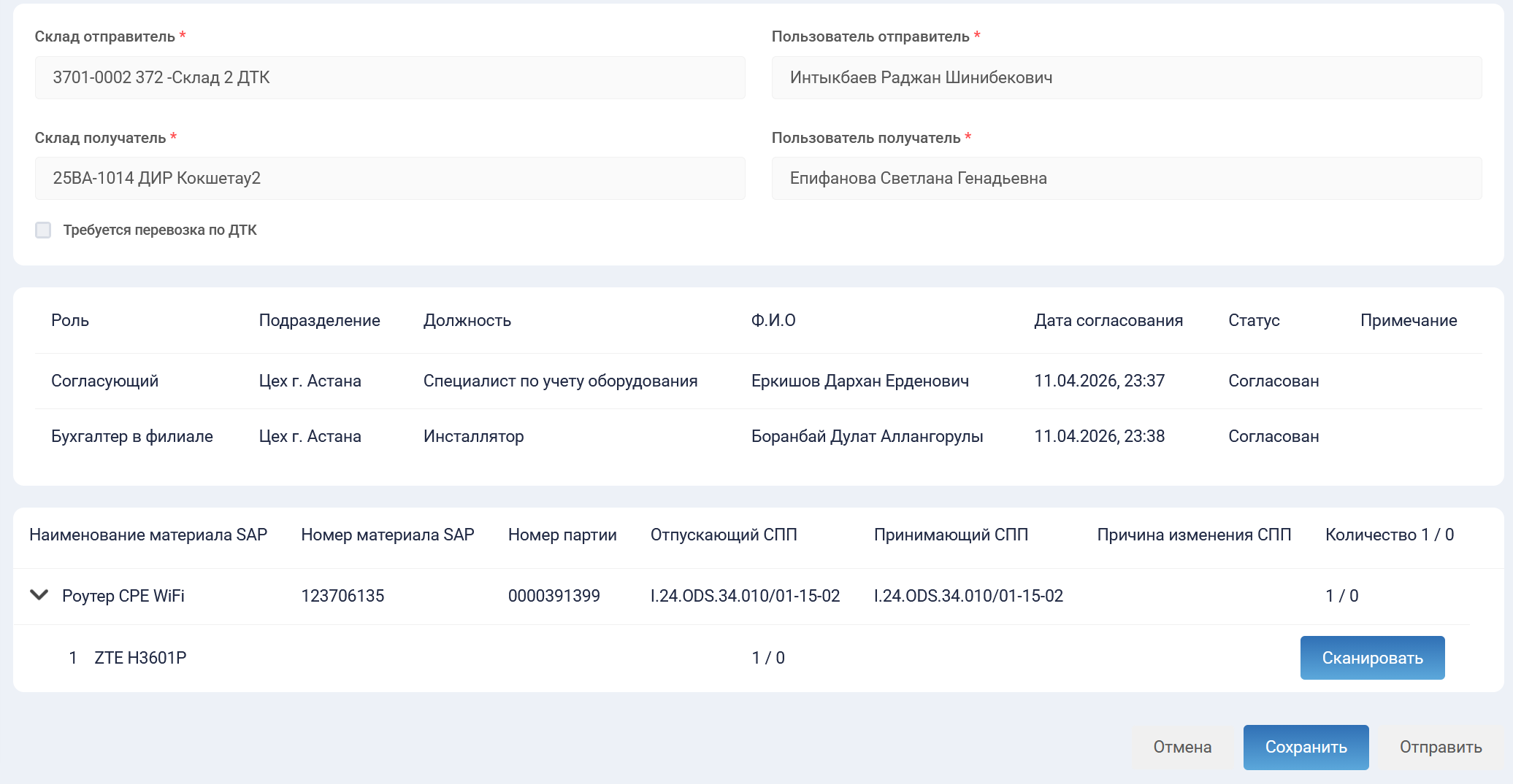 После проведения сканирования отправляемых серийных номеров МОЛ отправляющего склада может нажать на кнопку “Отправить” и документ перейдет в работу принимающему МОЛу.