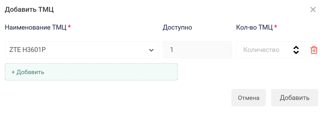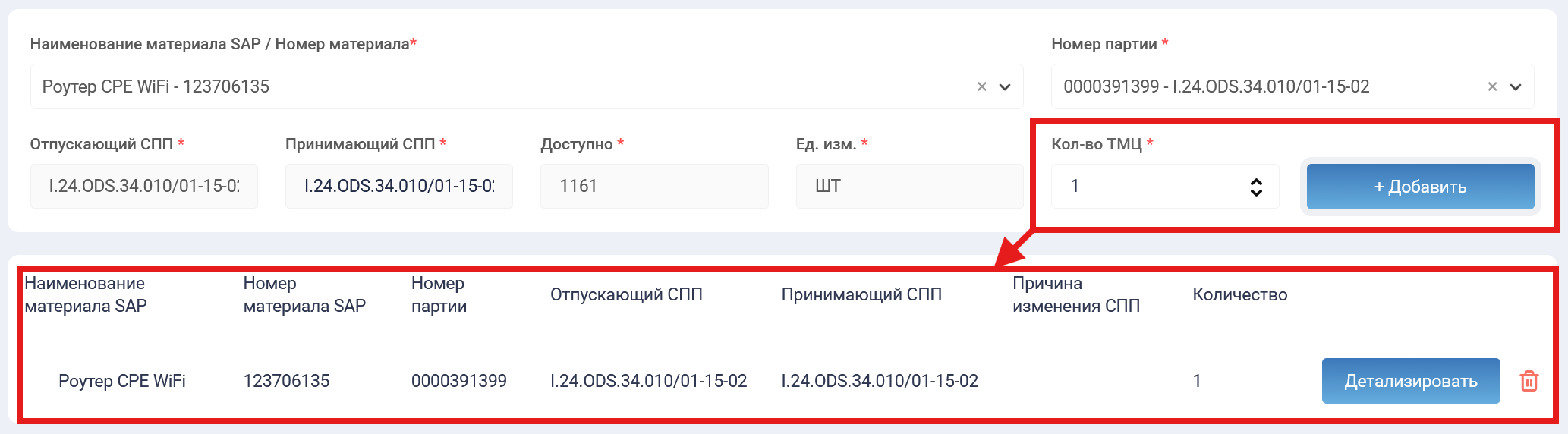 Добавив нужную партию в документ инициатор нажимает на кнопку “Детализировать”, где пользователю отобразятся товарные позиции из Track&Trace с выбранным номером материала SAP. Инициатору нужно выбрать какая товарная позиция будет перемещаться, а так же указать количество ТМЦ. При необходимости инициатор может добавить другие товарные позиции нажатием на кнопку “Добавить” под полем “Наименование ТМЦ”: