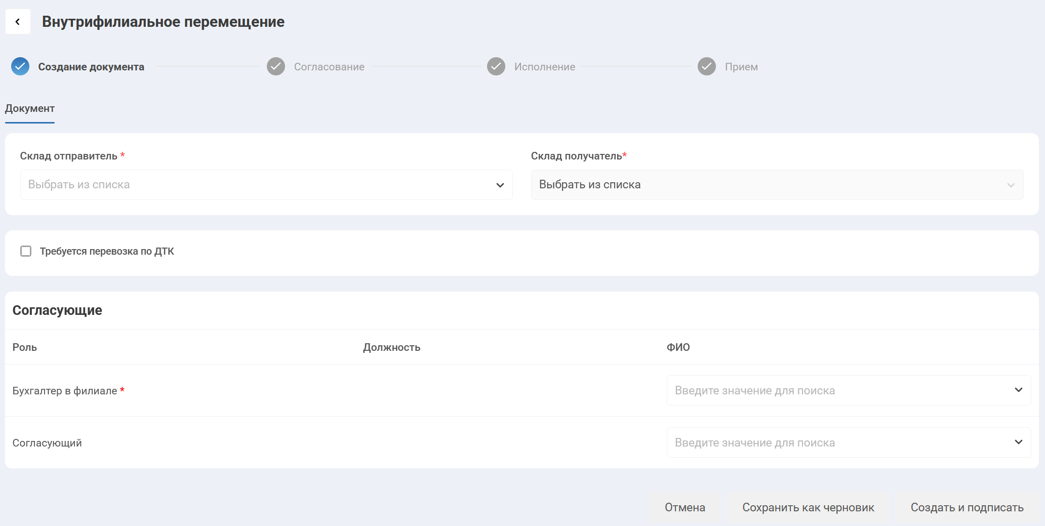 Инициатор выбирает “Внутрифилиальное перемещение” под кнопкой “Добавить” в разделе “Исходящие документы”. Пользователю открывается документ “Внутрифилиальное перемещение” на этапе “Создание документа”: В поле “Склад отправитель” инициатор выбирает склад, с которого будет делаться перемещение ТМЦ. Если МОЛ склада авторизовывался в Track&Trace и выбранный склад числится за его учетной записью в ТТ, то в появившемся поле “Пользователь отправитель” автоматически отобразится МОЛ склада.