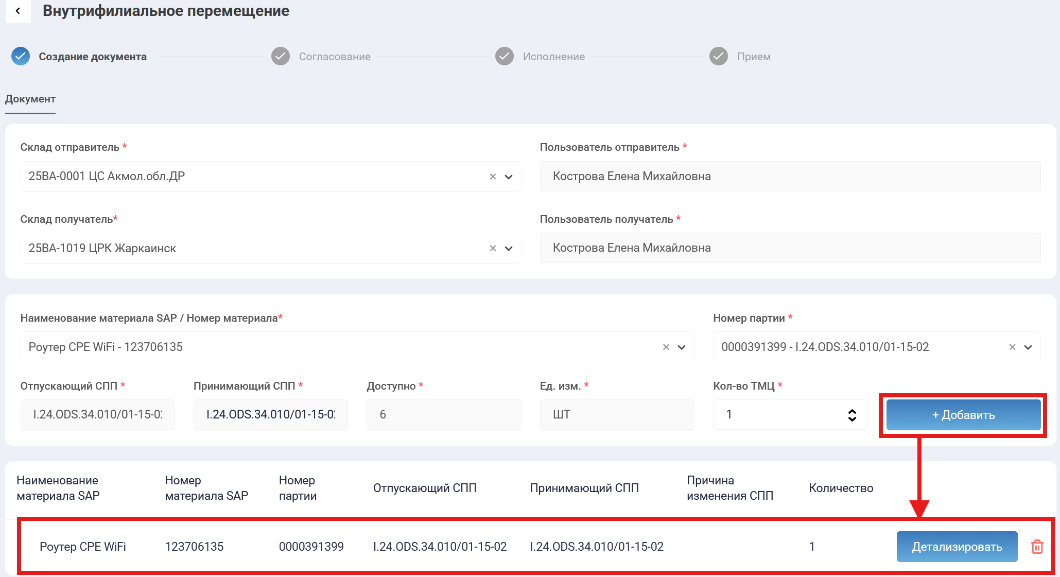 Добавив нужную партию в документ инициатор нажимает на кнопку “Детализировать”, где пользователю отобразятся товарные позиции из Track&Trace с выбранным номером материала SAP. Инициатору нужно выбрать какая товарная позиция будет перемещаться, а так же указать количество ТМЦ. При необходимости инициатор может добавить другие товарные позиции нажатием на кнопку “Добавить” под полем “Наименование ТМЦ”: После детализации перемещаемых товарных позиций и количества инициатор указывает согласующих, обязательно указав бухгалтера. После заполнения всех данных инициатор нажимает на кнопку “Создать и подписать”, после чего документ уходит на согласование.