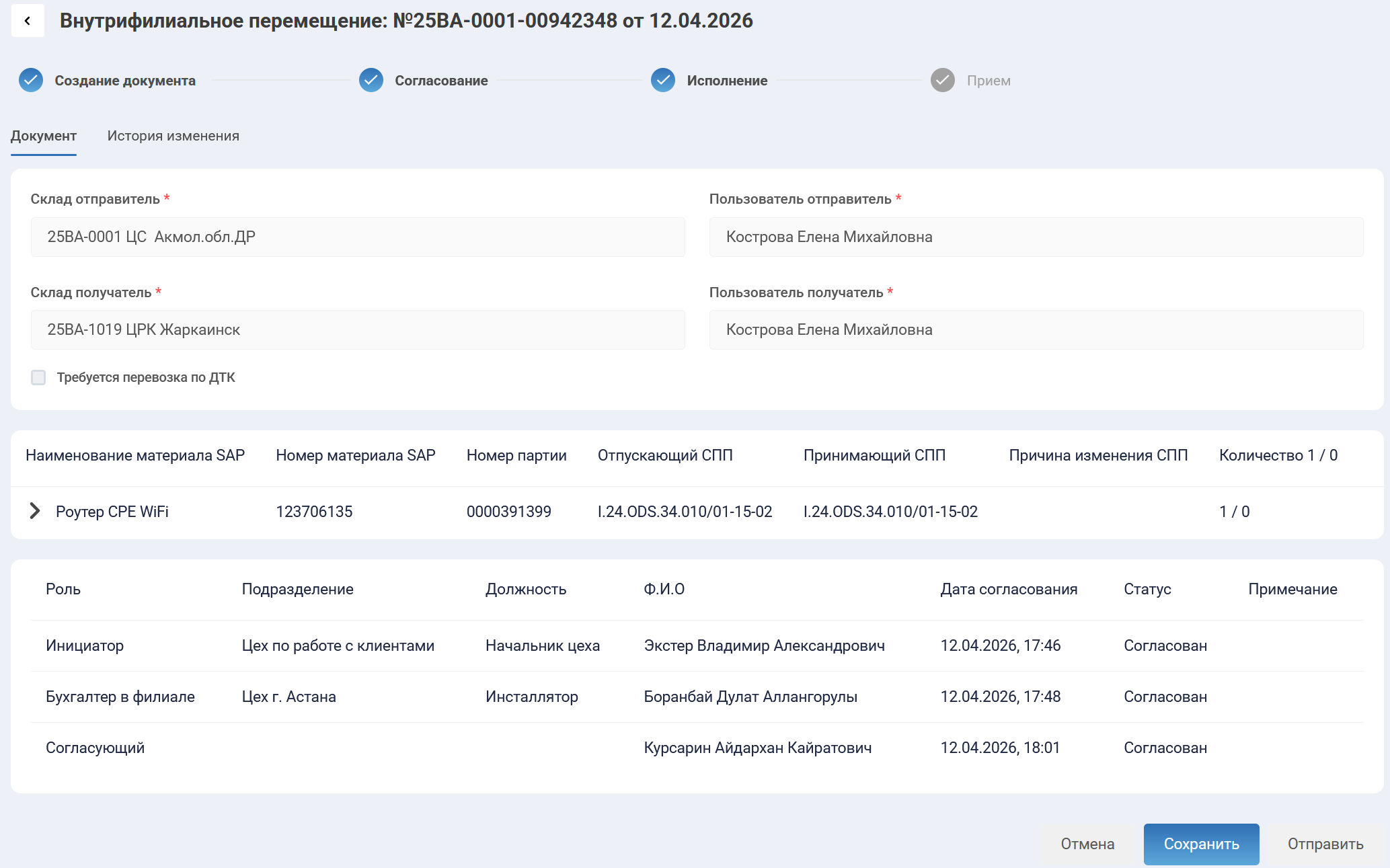 Отпускающий МОЛ найдет согласованный документ “Внутрифилиальное перемещение” в своих “Исходящих документах” в статусе “Согласован”. Открыв документ для просмотра (документ будет на этапе “Исполнение”) отпускающий МОЛ должен нажать на черную стрелочку в нужном наименовании материала SAP, где ему будет показана кнопка сканирования. Аналогичным образом документ отображается и в мобильном приложении. После проведения сканирования отправляемых серийных номеров МОЛ отправляющего склада может нажать на кнопку “Отправить” и документ перейдет на следующий шаг.