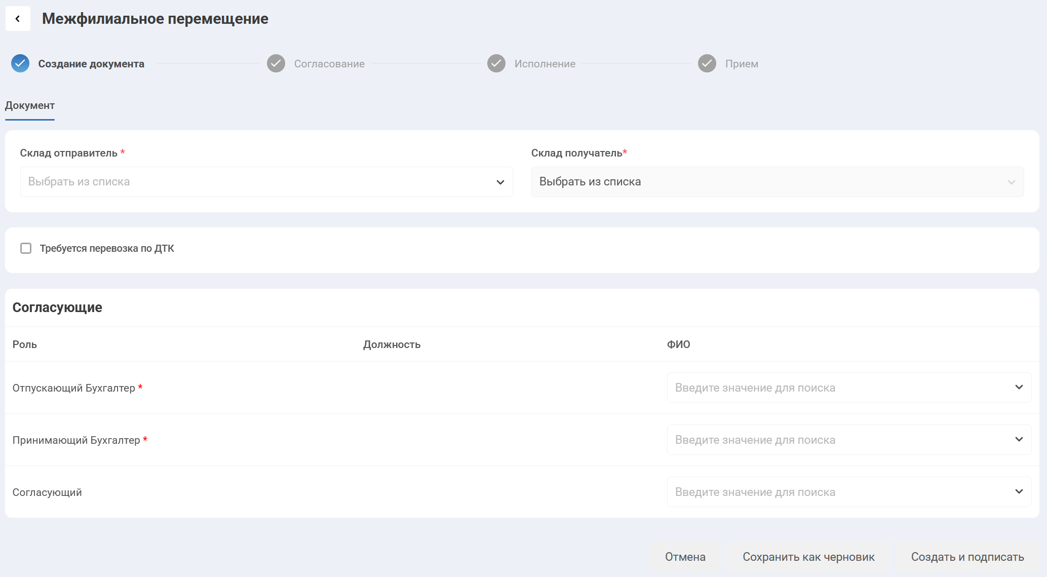 После детализации перемещаемых товарных позиций и количества инициатор указывает согласующих, обязательно указав бухгалтеров и с отпускающей, и с принимающей стороны.
