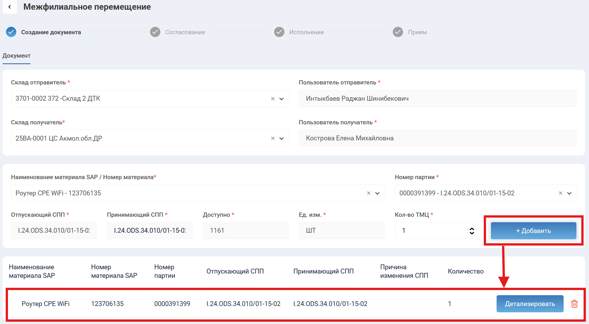 Добавив нужную партию в документ инициатор нажимает на кнопку “Детализировать”, где пользователю отобразятся товарные позиции из Track&Trace с выбранным номером материала SAP. Инициатору нужно выбрать какая товарная позиция будет перемещаться, а так же указать количество ТМЦ. При необходимости инициатор может добавить другие товарные позиции нажатием на кнопку “Добавить” под полем “Наименование ТМЦ”: