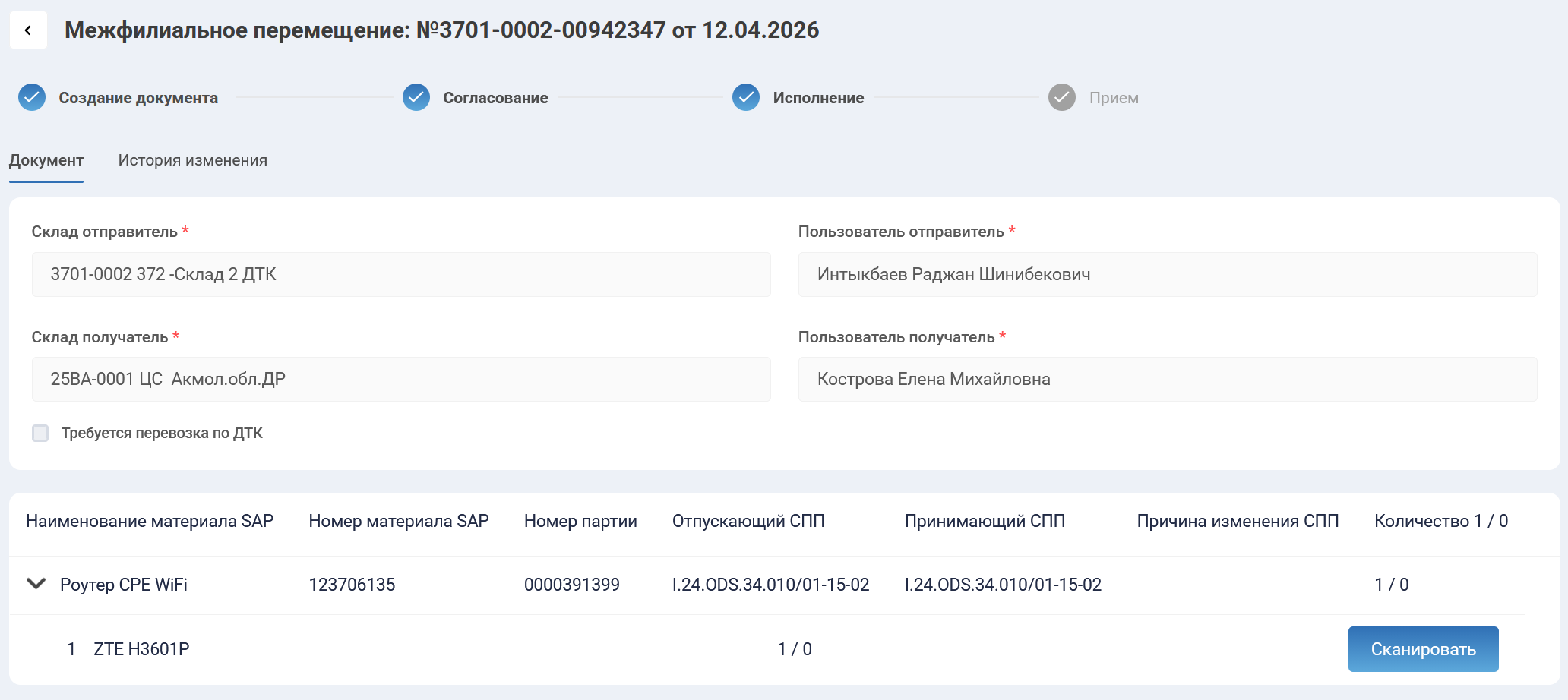 Отпускающий МОЛ найдет согласованный документ “Межфилиальное перемещение” в своих “Исходящих документах” в статусе “Согласован”. Открыв документ для просмотра (документ будет на этапе “Исполнение”) отпускающий МОЛ должен нажать на черную стрелочку в нужном наименовании материала SAP, где ему будет показана кнопка сканирования. Аналогичным образом документ отображается и в мобильном приложении.