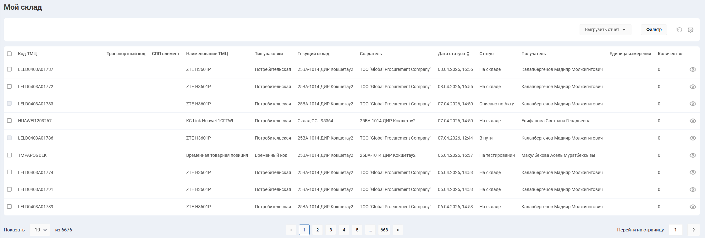 Информация в разделе “Мой склад” отображается в табличном виде и поддерживает работу с фильтром, персонализацию отображения информации в разделе, выгрузку отчетов и постраничный переход, при нажатии на иконку с глазом в крайней правой колонке таблицы пользователю откроется карточка ТМЦ по данному серийному номеру