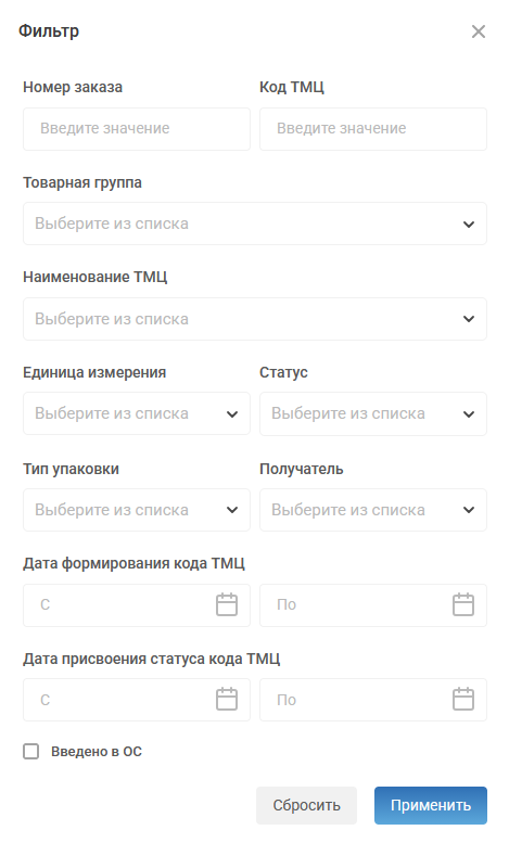 - Статус - отображение кодов ТМЦ и ОС, которые на текущий момент имеют нужный пользователю статус. Поддерживает выбор нескольких статусов в рамках одной фильтрации;