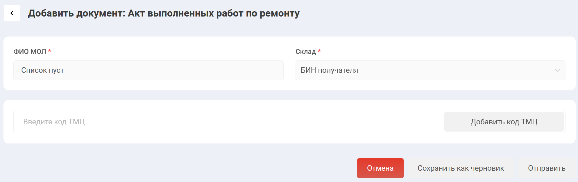 Если добавляемый серийный номер успешно добавился в документ, то система автоматически определит данные МОЛа и склада, эти данные заполнятся в полях “ФИО МОЛ” и “Склад”. ВАЖНО: с момента успешного добавления первого серийного номера в документ пользователь сможет передавать только те коды, которые принадлежат определившемуся складу, в противном случае при добавлении серийного номера, который не принадлежит данному складу, пользователю отобразится ошибка.