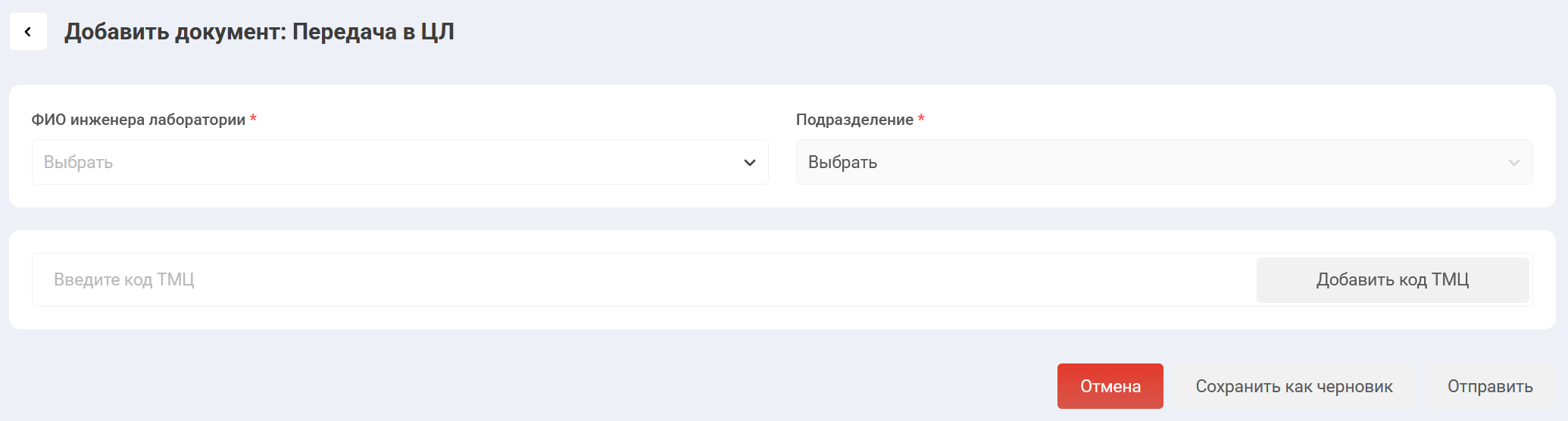 Сотрудник с ролью инженер лаборатории открывает документ “Передача в ЦЛ” из-под своего подразделения.