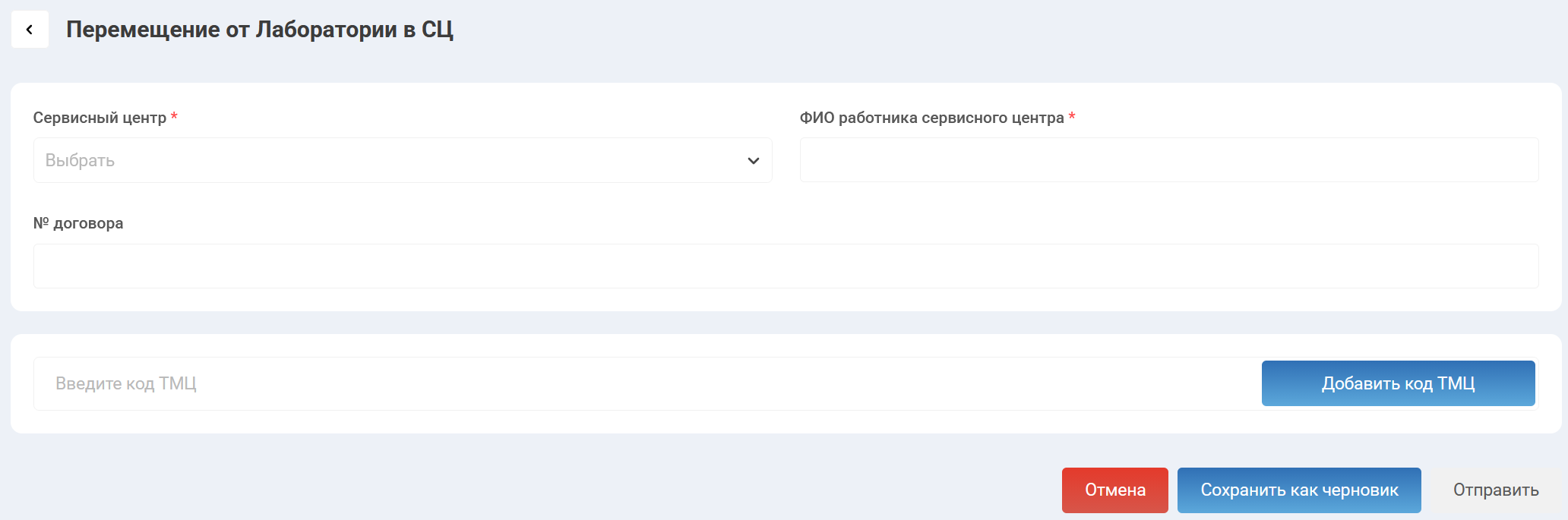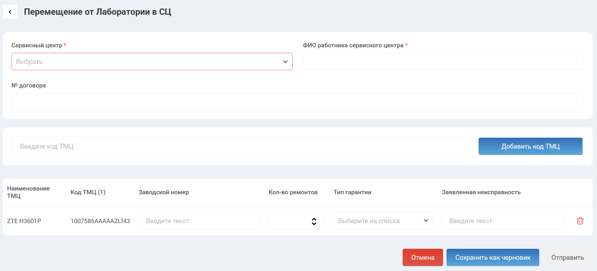 Внешний вид документа “Перемещение от Лаборатории в СЦ”:
