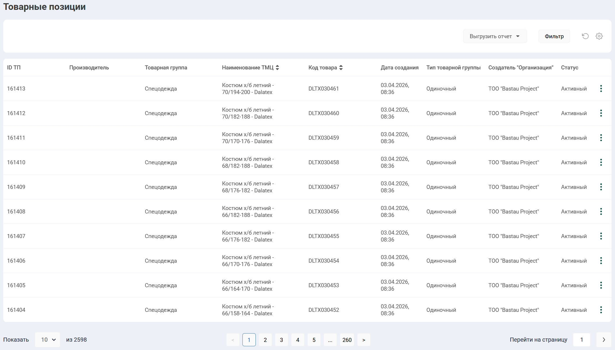 Раздел “Каталог товаров” поддерживает функционал работы с фильтрами, выгрузкой отчетов, персонализацией отображаемой информации и постраничного перехода.